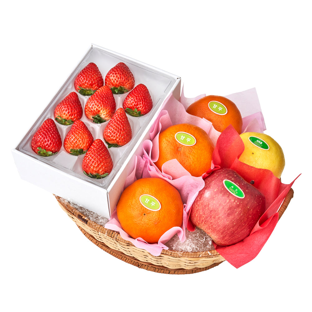 | 内容量 | 甘平(愛媛県産)×3、苺9粒(静岡県、佐賀県、栃木県、熊本県、千葉県、長崎県、福岡県、茨城県、徳島県または香川県産)、日向夏(宮崎県産)、ふじ(青森県または長野県産)×各1(篭入) |