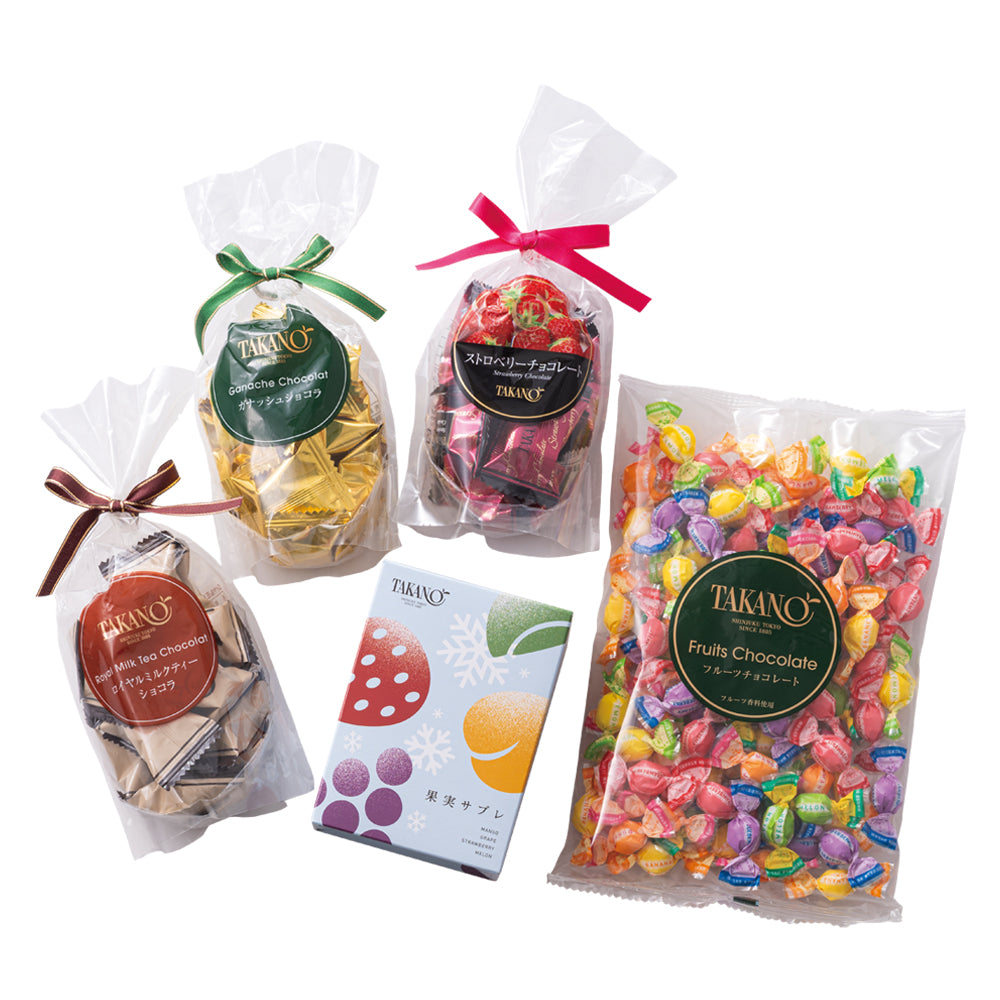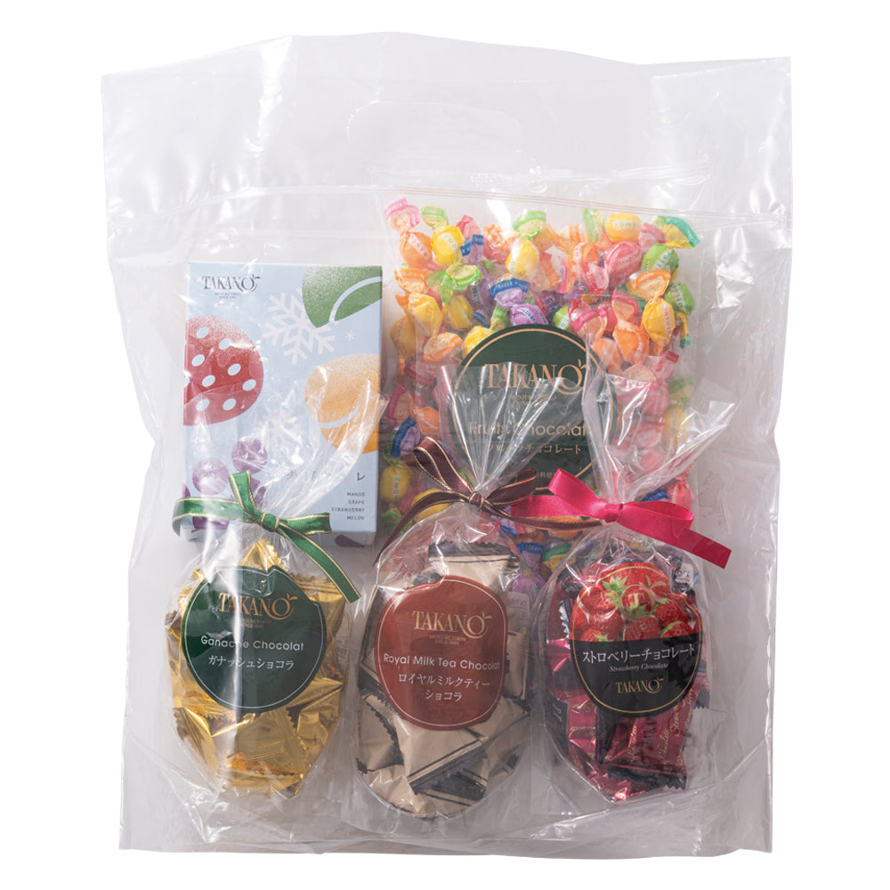 | 内容量 | フルーツチョコレート平袋 145g(個包装紙込み)、ガナッシュショコラSPリボン 70g(個包装紙込み)、ロイヤルミルクティーショコラSPリボン 70g(個包装紙込み)、ストロベリーチョコレートSPリボン 55g(個包装紙込み)、果実サブレ ウインターパッケージ×各1 |
