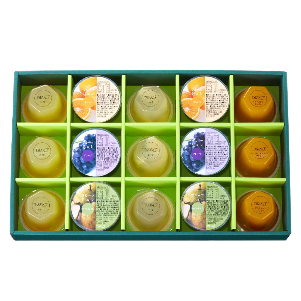 | 内容量 | 果実ゼリー(ピーチ、パイン、アルフォンソマンゴー×各3)、フルーツジュレ(ピンクグレープフルーツ、グレープ、ラ・フランス×各2) | ||