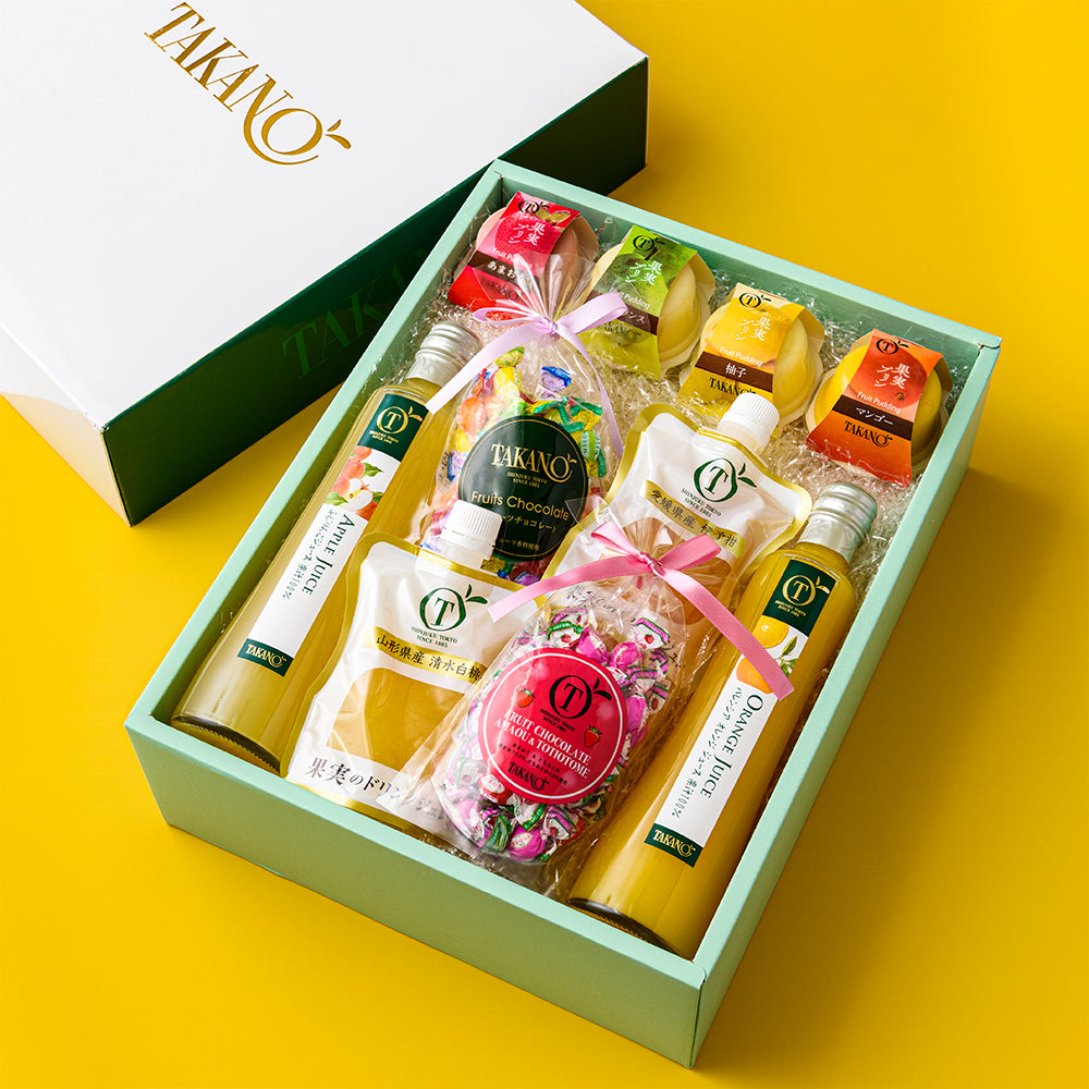 | 内容量 | ジュース350ml(ふじりんご、バレンシアオレンジ×各1)、フルーツチョコレートSPリボン80g(個包装紙込み)、あまおう&とちおとめチョコレートSPリボン65g(個包装紙込み)×各1、果実プリン(あまおう、マンゴー、ラ・フランス、柚子×各1)、果実のドリンクジュレ(愛媛県産伊予柑、山形県産清水白桃×各1) |