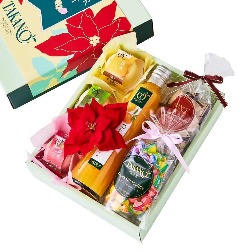 | 内容量 | 果実プリン(あまおう、ラ・フランス、柚子×各1)、フルーツチョコレートSPリボン80g(個包装紙込み)、ロイヤルミルクティーショコラSPリボン70g(個包装紙込み)、バレンシアオレンジジュース350ml×各1、ポインセチア(造花)×1 |