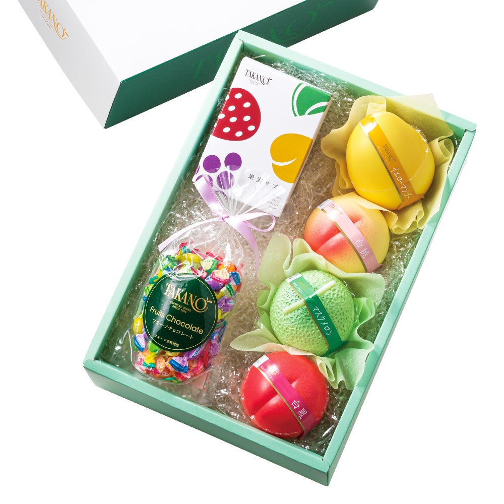 | 内容量 | 果実ピュアゼリー(マスクメロン、白桃、白鳳、イエローマンゴー×各1)、果実サブレ5枚入×1、フルーツチョコレートSPリボン 80g(個包装紙込み)×1 |