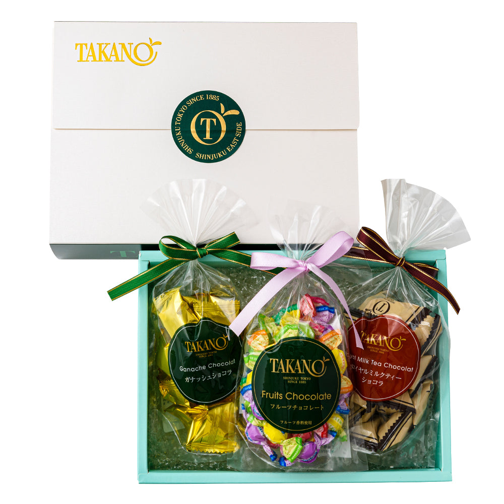 新宿高野オリジナルのフルーツチョコレートと季節限定チョコレートをセットにしました。 ■フルーツチョコレート:風味が違う6種類の味が楽しめるカラフルなひとくちサイズのかわいいチョコレートです。■ガナッシュショコラ:なめらかな口どけのガナッシュをココアパウダーでコーティングした、大人風味のキューブ型チョコレートです。■ロイヤルミルクティーショコラ:ホワイトチョコレートに紅茶パウダーを練り込んだ、なめらかなキューブ型チョコレート。