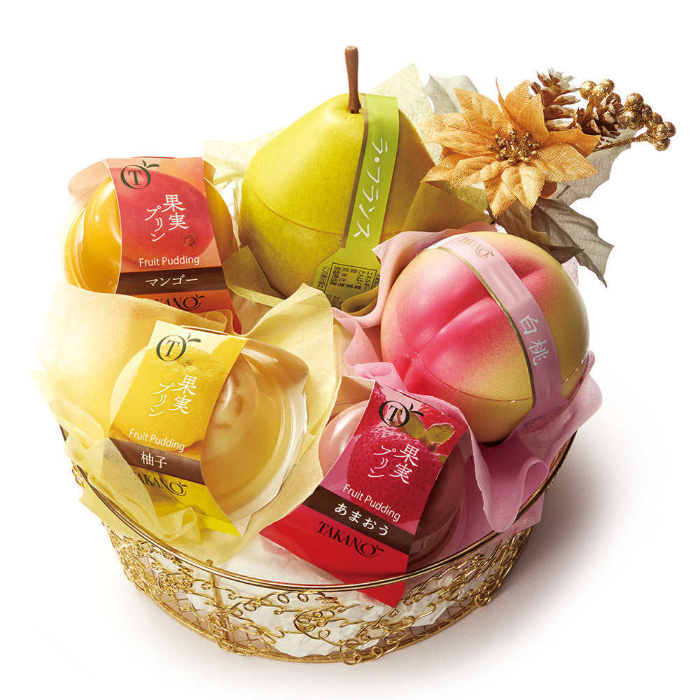 | 内容量 | 果実ピュアゼリー(白桃、ラ・フランス×各1)、果実プリン(あまおう、柚子、マンゴー×各1)、クリスマスオーナメント×1 |