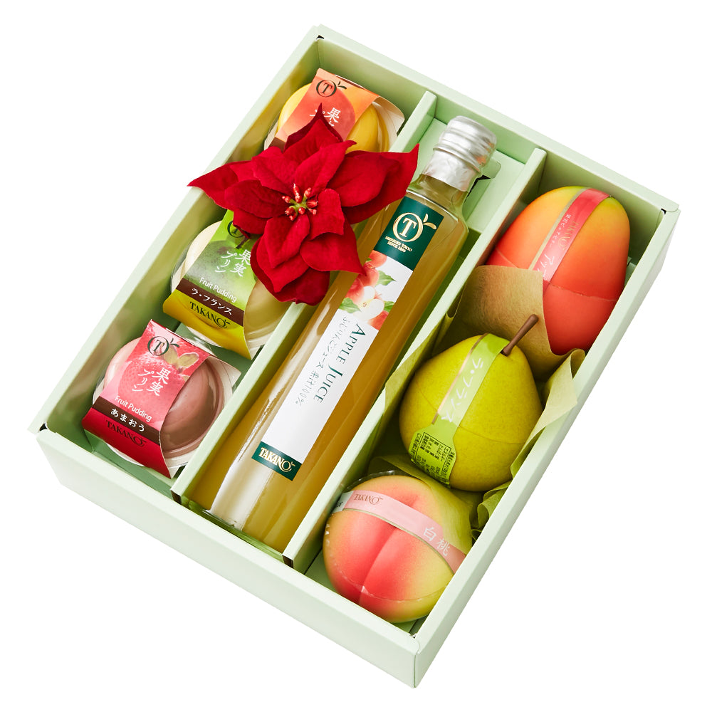 | 内容量 | ふじりんごジュース350ml×1、果実プリン(あまおう、ラ・フランス、マンゴー×各1)、果実ピュアゼリー(白桃、アップルマンゴー、ラ・フランス×各1)、ポインセチア(造花)×1 |
