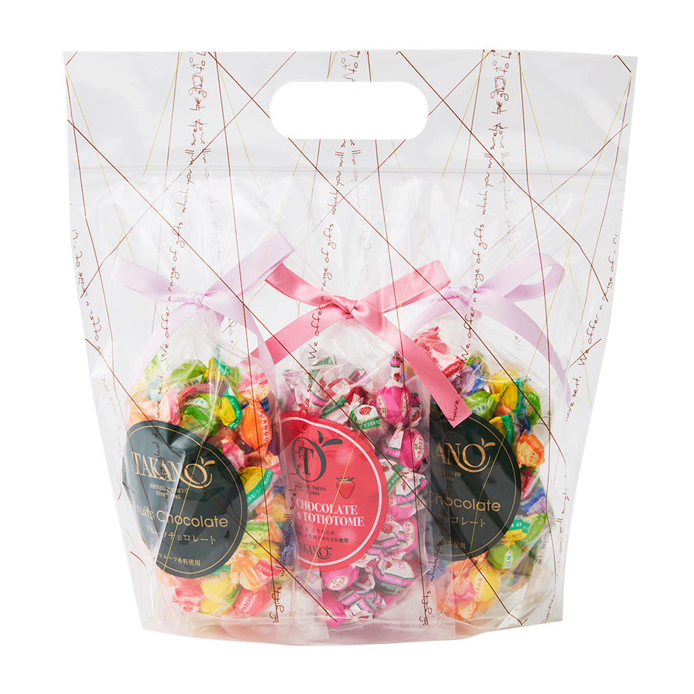 ■そのままお渡しいただけるチャック付き袋にお詰めしました。ちょっとしたプレゼントにおすすめです。■フルーツチョコレート:ブルーベリー、ストロベリー、レモン、マンゴー、メロン、バナナの6種類の味が楽しめるフルーツチョコレートです。■あまおう&とちおとめチョコレート:あまおう、とちおとめ苺のそれぞれのパウダーを使用した、甘酸っぱい2種類のチョコレート。