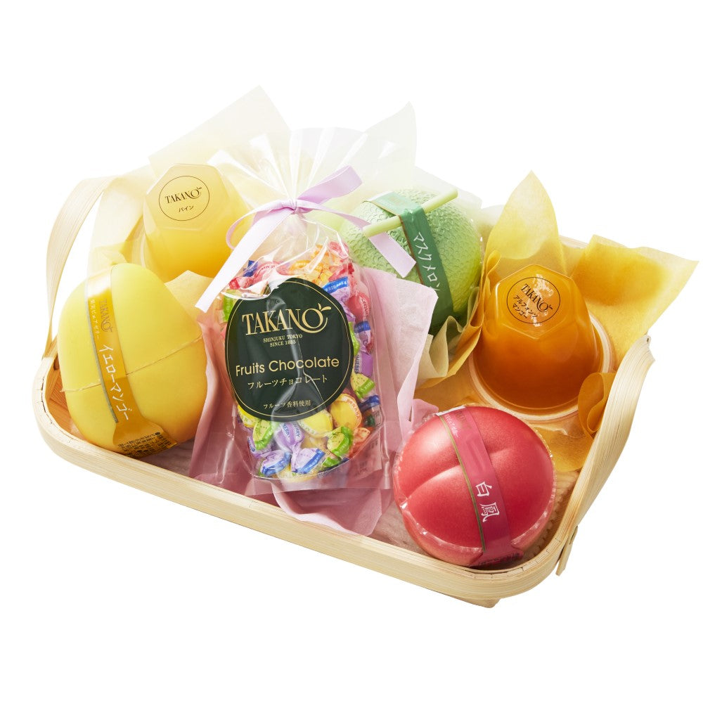 | 内容量 | 果実ゼリー(パイン、アルフォンソマンゴー×各1)、果実ピュアゼリー(マスクメロン、白鳳、イエローマンゴー×各1)、フルーツチョコレートSPリボン80g(個包装紙込み)×1(篭入) |