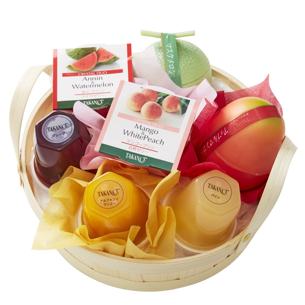 | 内容量 | 果実ゼリー(グレープ、パイン、アルフォンソマンゴー×各1)、果実ピュアゼリー(マスクメロン、アップルマンゴー×各1)、クリスタルデュオ(マンゴープリン&白桃ゼリー、杏仁プリン&スイカゼリー×各1)(篭入) |