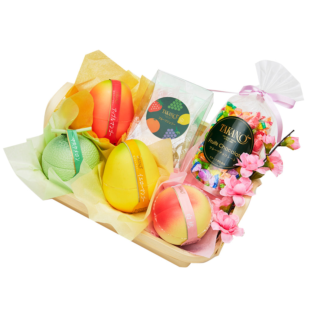| 内容量 | 果実ピュアゼリー(マスクメロン、白桃、アップルマンゴー、イエローマンゴー×各1)、フルーツジェリー×1、フルーツチョコレートSPリボン80g(個包装紙込み)×1、桃の花(造花)×1 |