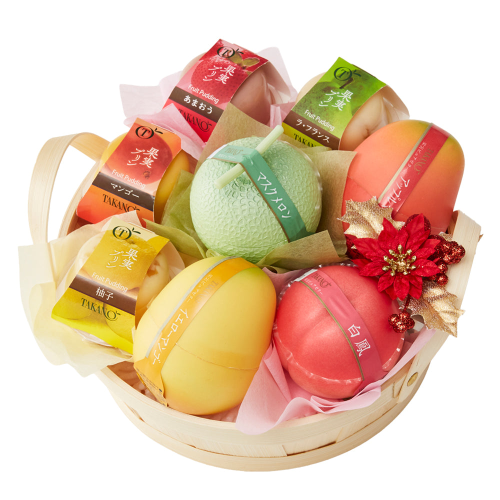 | 内容量 | 果実ピュアゼリー(マスクメロン、白鳳、アップルマンゴー、イエローマンゴー×各1)、果実プリン(あまおう、ラ・フランス、柚子、マンゴー×各1)、オーナメント×1(篭入) |
