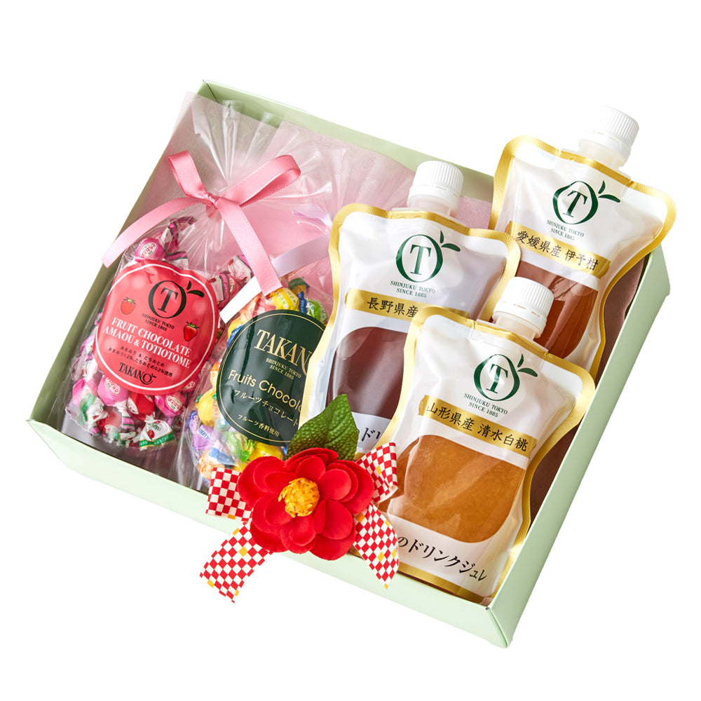 | 内容量 | フルーツチョコレートSPリボン80g(個包装紙込み)×1、あまおう&とちおとめチョコレートSPリボン65g(個包装紙込み)×1、果実のドリンクジュレ(長野県産巨峰、山形県産清水白桃、愛媛県産伊予柑×各1)、椿クリップ(造花)×1 |