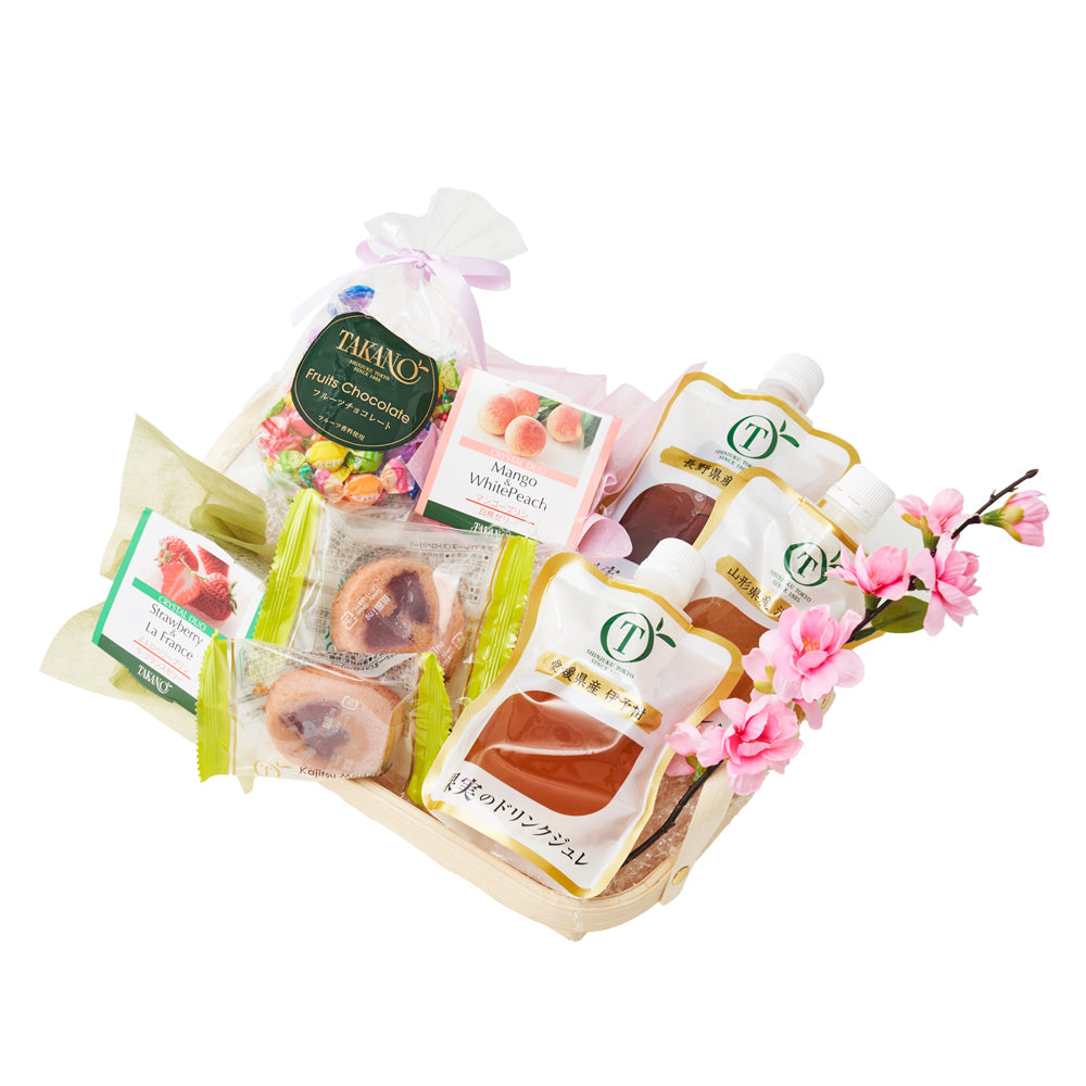 | 内容量 | 果実のドリンクジュレ(愛媛県産伊予柑、山形県産清水白桃、長野県産巨峰×各1)、クリスタルデュオ(マンゴープリン&白桃ゼリー、ストロベリープリン&ラ・フランスゼリー×各1)、フルーツチョコレートSPリボン80g(個包装紙込み)×1、果実マドレーヌ(ストロベリー×2)、桃の花(造花)×1(篭入) |