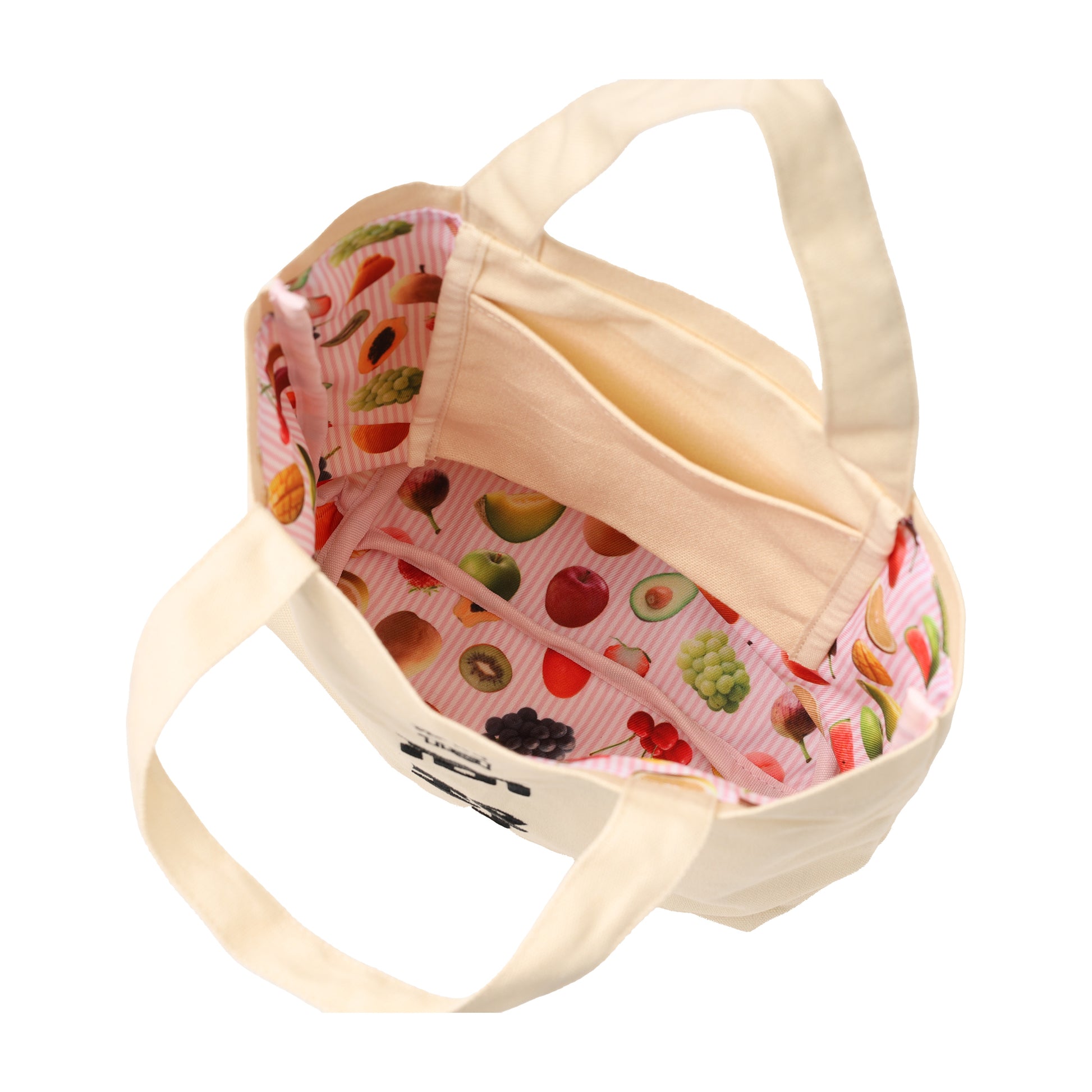 「新宿高野」の文字デザイン刺繍が入ったミニサイズのトートバッグです。内側は色とりどりのフルーツ柄の生地を使用しており、ポケットもついているので小物の整理にも便利です。ちょっとしたお出かけやランチなど、普段使いもしやすいアイテムです。