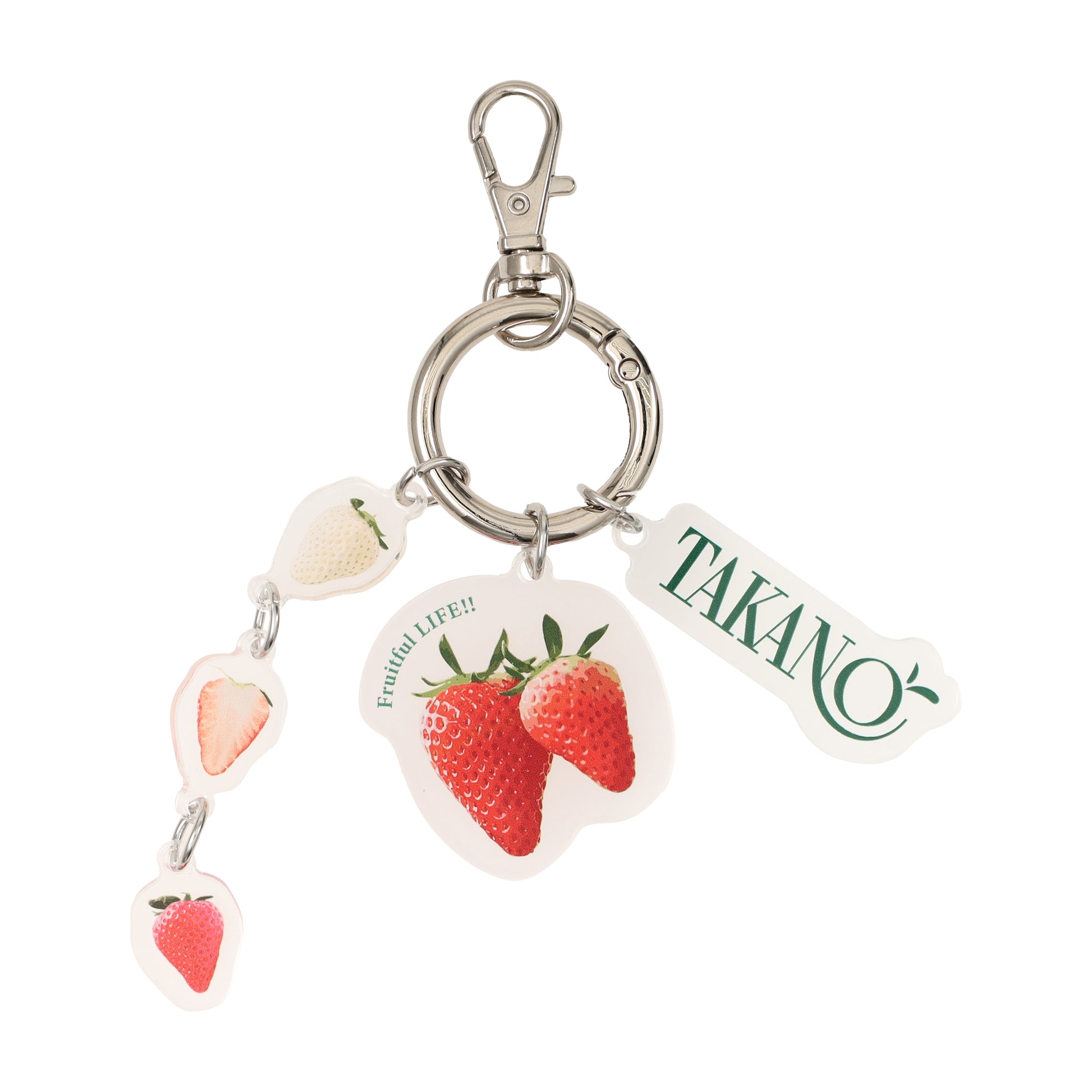 フルーツ専門店「新宿高野」のアクリルチャームです。「TAKANO」のロゴとジューシーな苺柄のアクリルチャームがポイントです。ナスカン付きでバッグなどに簡単に取り付けることができます。