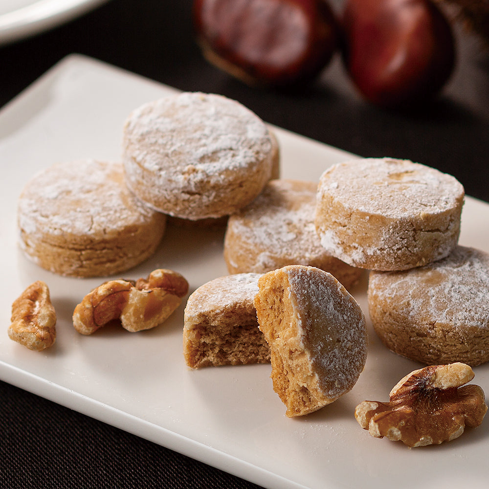| 原材料 | 小麦粉(国内製造)、粉糖、加糖栗ペースト、ショートニング、マーガリン、くるみ、乾燥卵白/着色料(カラメル、カロチン)、乳化剤、酸化防止剤(V.E、V.C)、香料、(一部に卵・小麦・乳成分・くるみ・大豆を含む) | ||