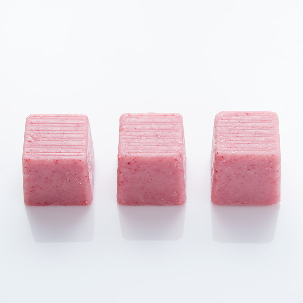 ストロベリーフリーズドライパウダーを練り込み甘酸っぱく仕立てたキューブ型チョコレート。