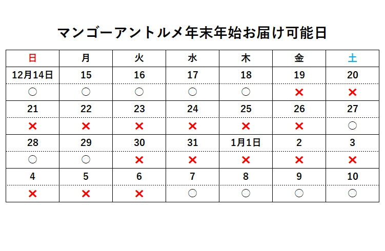 年末年始につきまして、お届け出来ない期間がございます。システム上、指定が出来てしまいますが、お断りさせていただいておりますのでご了承ください。下記カレンダーをご参照ください。