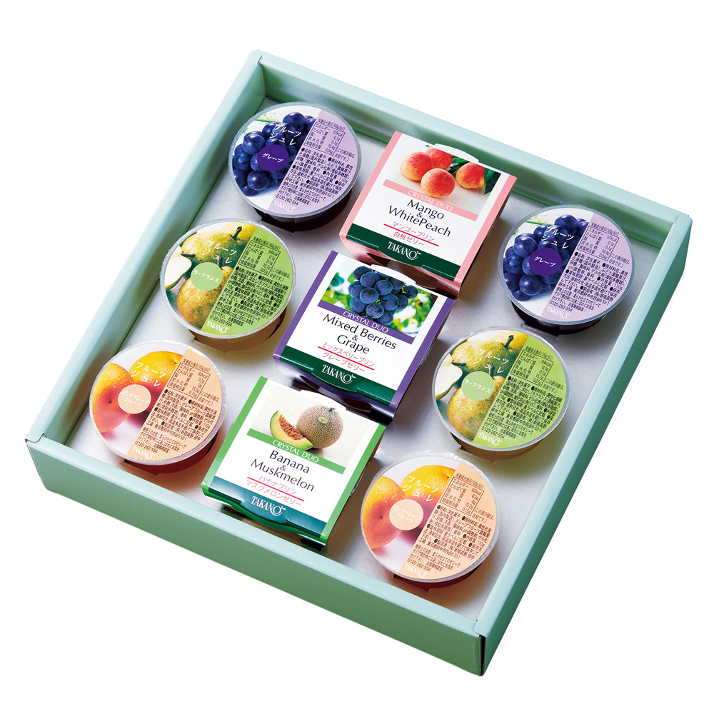 | 内容量 | クリスタルデュオ(バナナプリン&マスクメロンゼリー、ミックスベリープリン&グレープゼリー、マンゴープリン&白桃ゼリー×各1)、フルーツジュレ(ラ・フランス、ピンクグレープフルーツ、グレープ×各2) | ||
