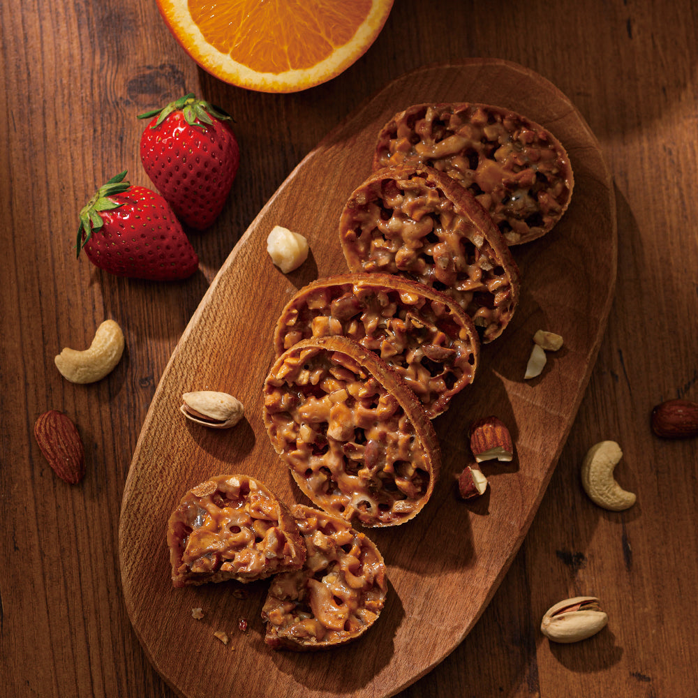 フルーツ風味のサブレとアーモンド、カシュー、ピスタチオのナッツで仕立てたフロランタン。ティータイムやデザートに、紅茶やコーヒーなどと一緒にお召し上がりください。