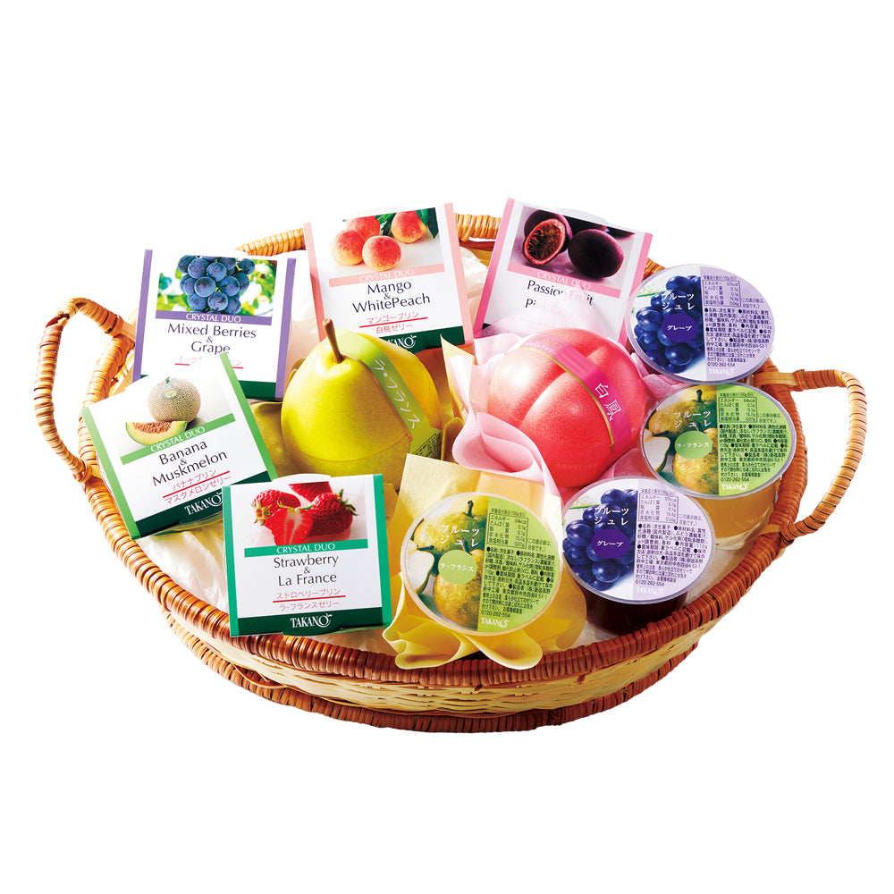 | 内容量 | 果実ピュアゼリー(ラ・フランス、白鳳×各1)、クリスタルデュオ(ミックスベリープリン&グレープゼリー、バナナプリン&マスクメロンゼリー、ストロベリープリン&ラ・フランスゼリー、マンゴープリン&白桃ゼリー、パッションフルーツプリン&ピンクグァバゼリー×各1)、フルーツジュレ(ラ・フランス、グレープ×各2) | ||