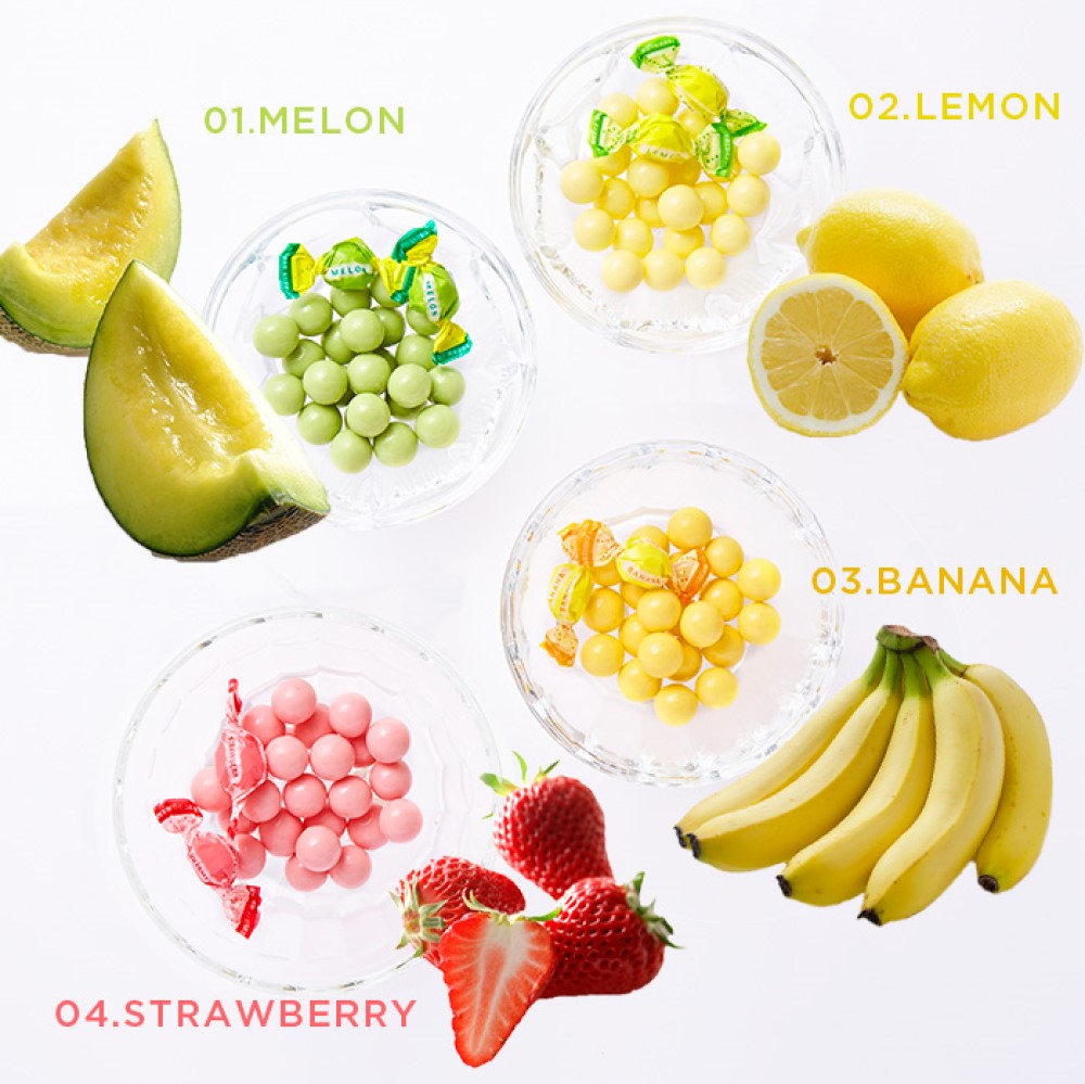| 原材料 | 砂糖(オーストラリア製造)、ココアバター、全粉乳、粉糖、植物油脂、乳糖、水あめ、いちごパウダー、バナナフレーク、ブルーベリーパウダー、レモンパウダー(デキストリン、レモン濃縮果汁)、メロンパウダー(デキストリン、メロン濃縮果汁)、マンゴーパウダー(デキストリン、マンゴーピューレ)/乳化剤(大豆由来)、光沢剤、酸味料、着色料(紅花色素、クチナシ、野菜色素、カロチノイド、ウコン、紅麹)、香料 | ||