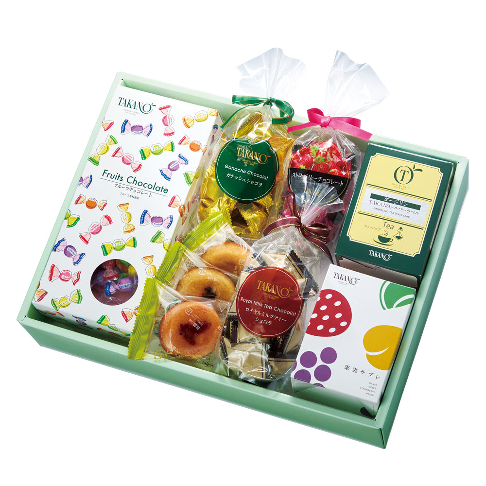 | 内容量 | フルーツチョコレートギフトボックス 200g(個包装紙込み)、ガナッシュショコラSPリボン 70g(個包装紙込み)、ロイヤルミルクティーショコラSPリボン 70g(個包装紙込み)、ストロベリーチョコレートSPリボン 55g(個包装紙込み)、果実サブレ5枚入、ティーバッグダージリン8pBOX 16g(2g×8袋)×各1、果実マドレーヌ(りんご、ストロベリー、ブルーベリー×各1) |