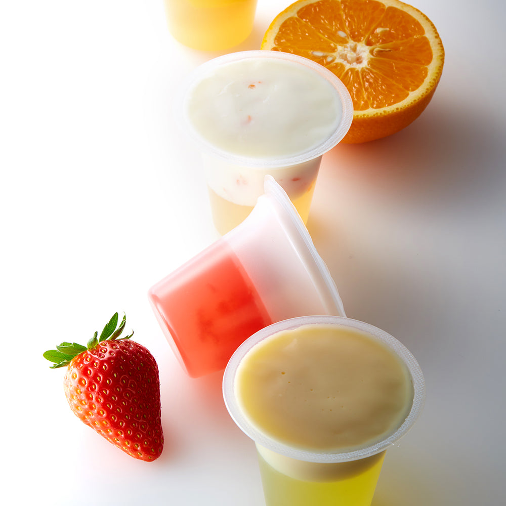 やわらかでコクのあるプリンと果汁や果肉を使用したなめらかなゼリーを2層に仕立てたフルーティーなデザートです。果実の風味と鮮やかな色合い、それぞれの味わいが奏でる絶妙なハーモニーをお楽しみいただけます。
